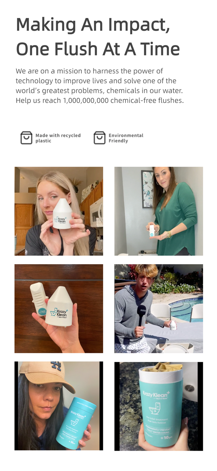 Place Krazy Klean in your toilet tank, and forget about it. Our Hydro-Mineral technology activates automatically and you enjoy a clean toilet for a decade to come. Krazy Klean prevents rings, stains, and buildup—no effort required.